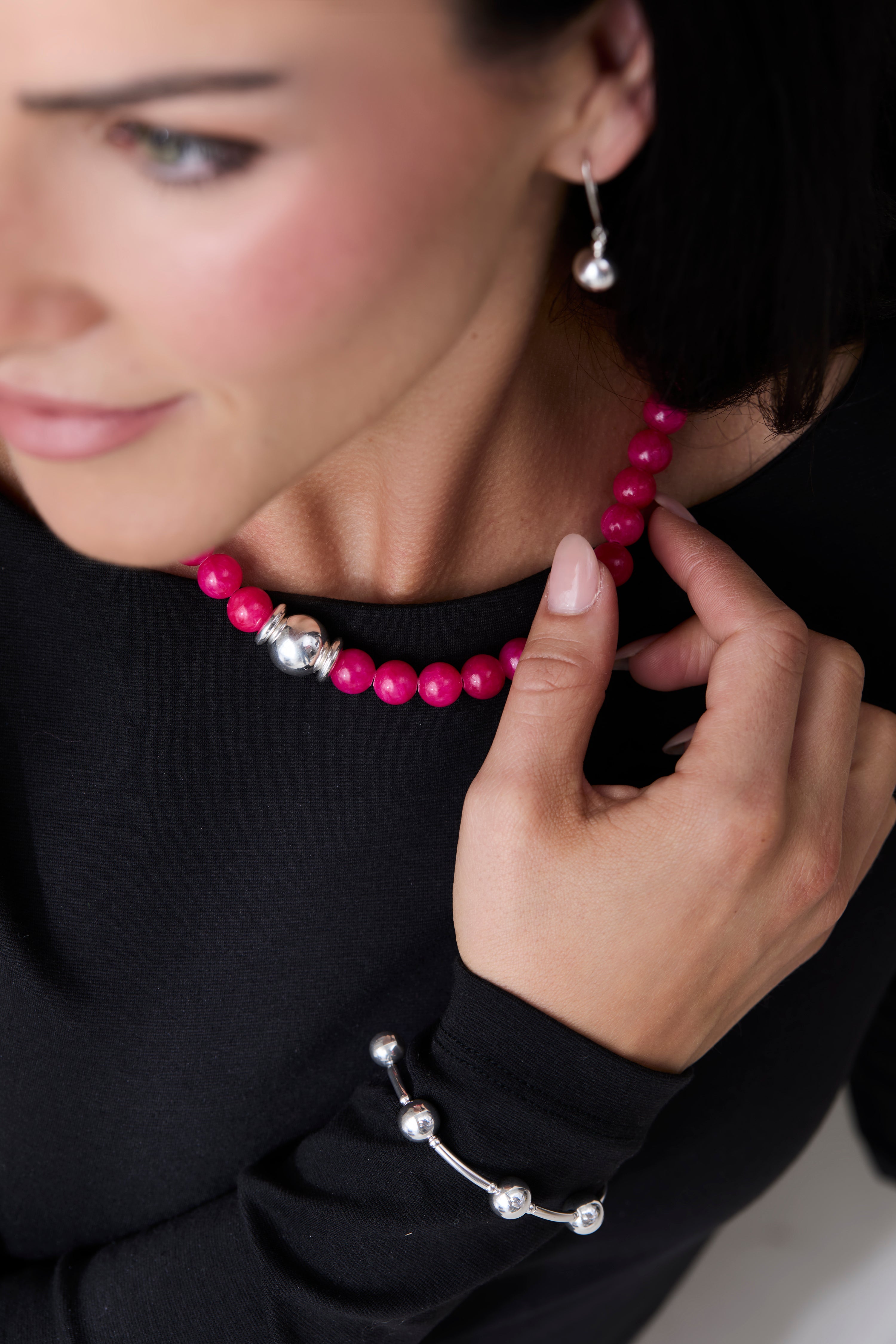 Bold colour meets modern silver in this vibrant gemstone necklace. A trio of sterling silver—one sphere nestled between two discs—creates a playful focal point against a strand of juicy dyed jade beads.