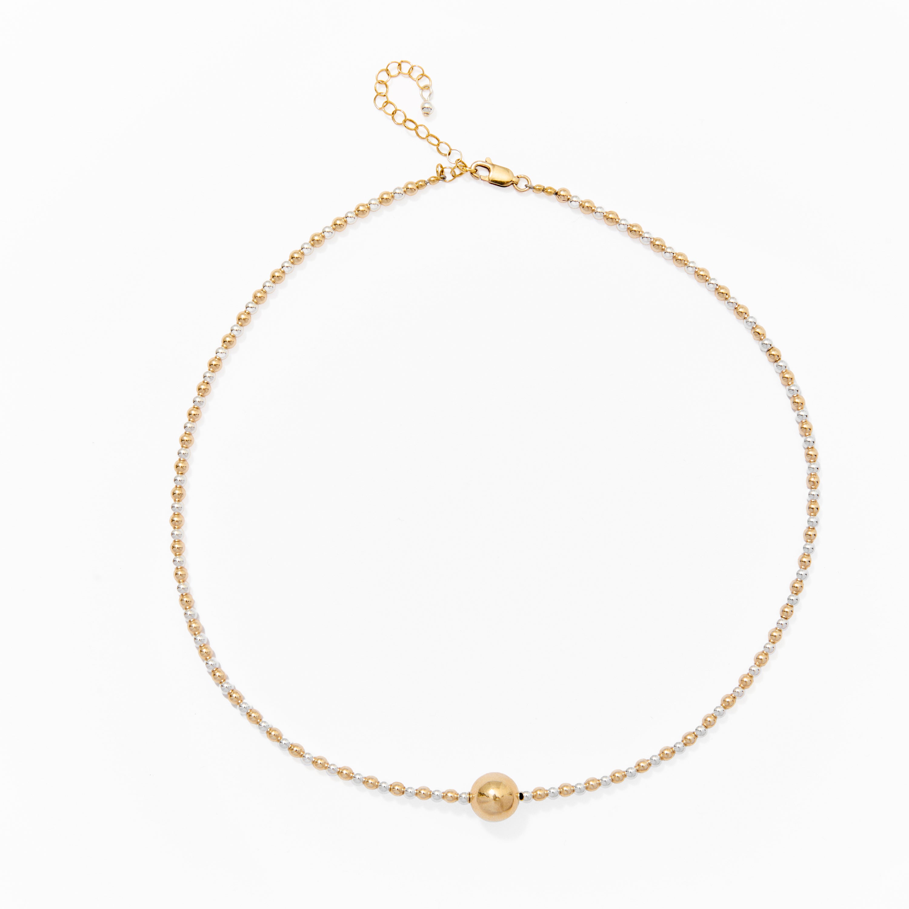 Where silver meets gold, magic happens. This luminous choker is crafted on a delicate rope of alternating metallic beads—each one catching the light like sun on water. A single gold sphere adds a sculptural focal point, striking the perfect balance between restraint and radiance. A modern heirloom in the making, ready for your next celebration or milestone moment.